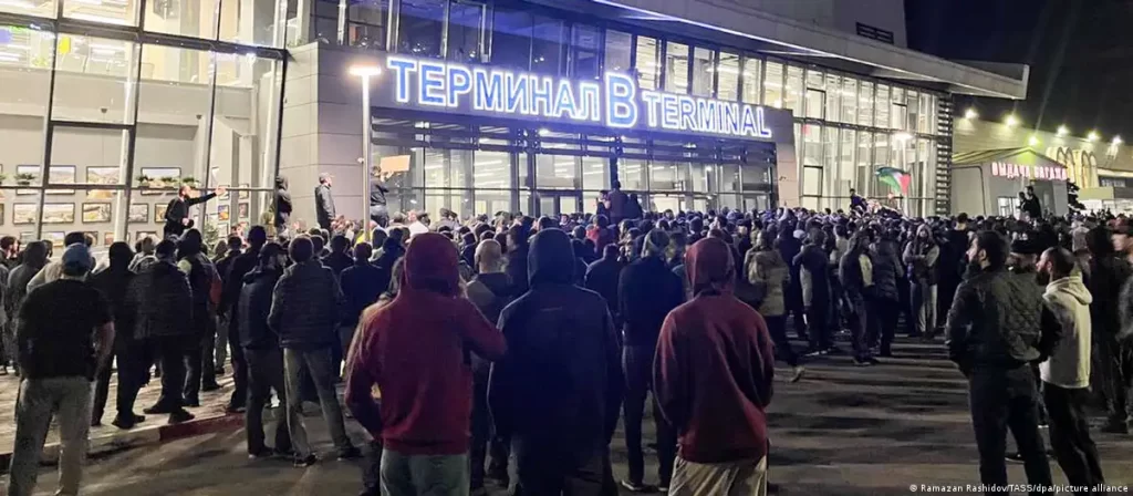 Știrile rusești spun că oamenii din mulțime au strigat sloganuri antisemite și au încercat să asalteze avionul, care aterizase de la Tel Aviv. Videoclipul de pe rețelele de socializare i-a arătat pe câțiva din mulțime de pe terenul de aterizare fluturând steaguri palestiniene.